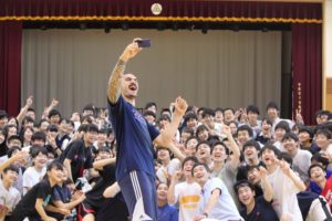 Steven氏はOKC Thundersのセンターとして活躍しているスター選手で、身長は何と213cm。登場の拍手とともに生徒からはあまりの背の高さに対する驚きの声が、そしてその後の自己紹介での”I love Japan!!”と言って下さり、歓喜の声が上がりました。皆いいリアクションでした!