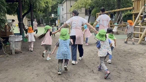 晴れた園庭で、子どもたちと走ったり、どろんこになって砂遊びをしたり。