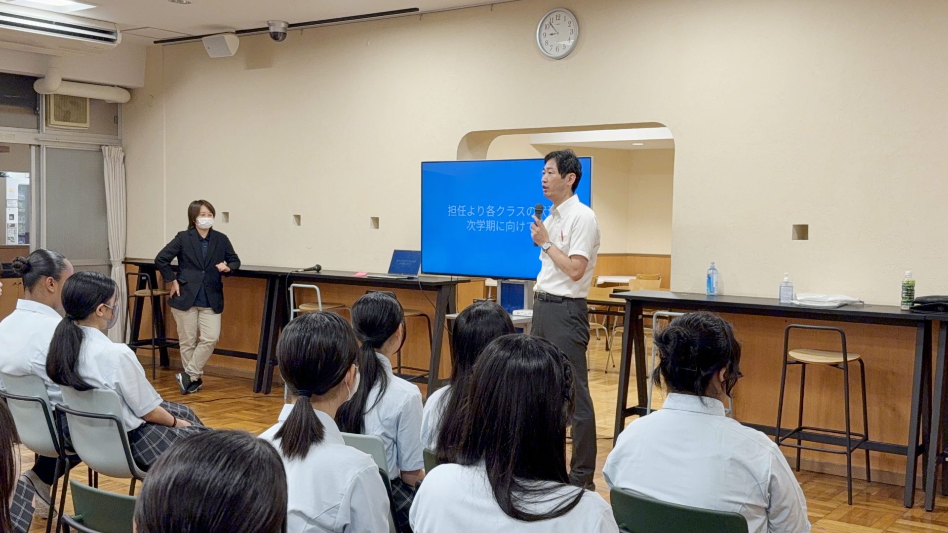 朝の集会では、1学期を振り返って担任の先生方のメッセージや、大学受験に通ずる学校生活の再確認、