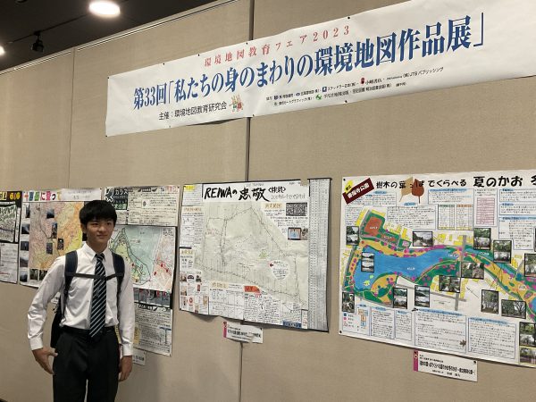 これは旭川市で行われた「私たちの身のまわりの環境地図作品展」の様子と「国土交通省国土地理院長賞」を受賞した4年生(高校1年生)の作品です。