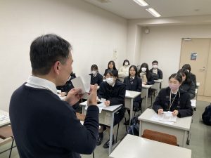 そしていよいよ授業参加です。二人の大学生がそれぞれ40分の模擬授業を行い、15期生は生徒役を務めました。