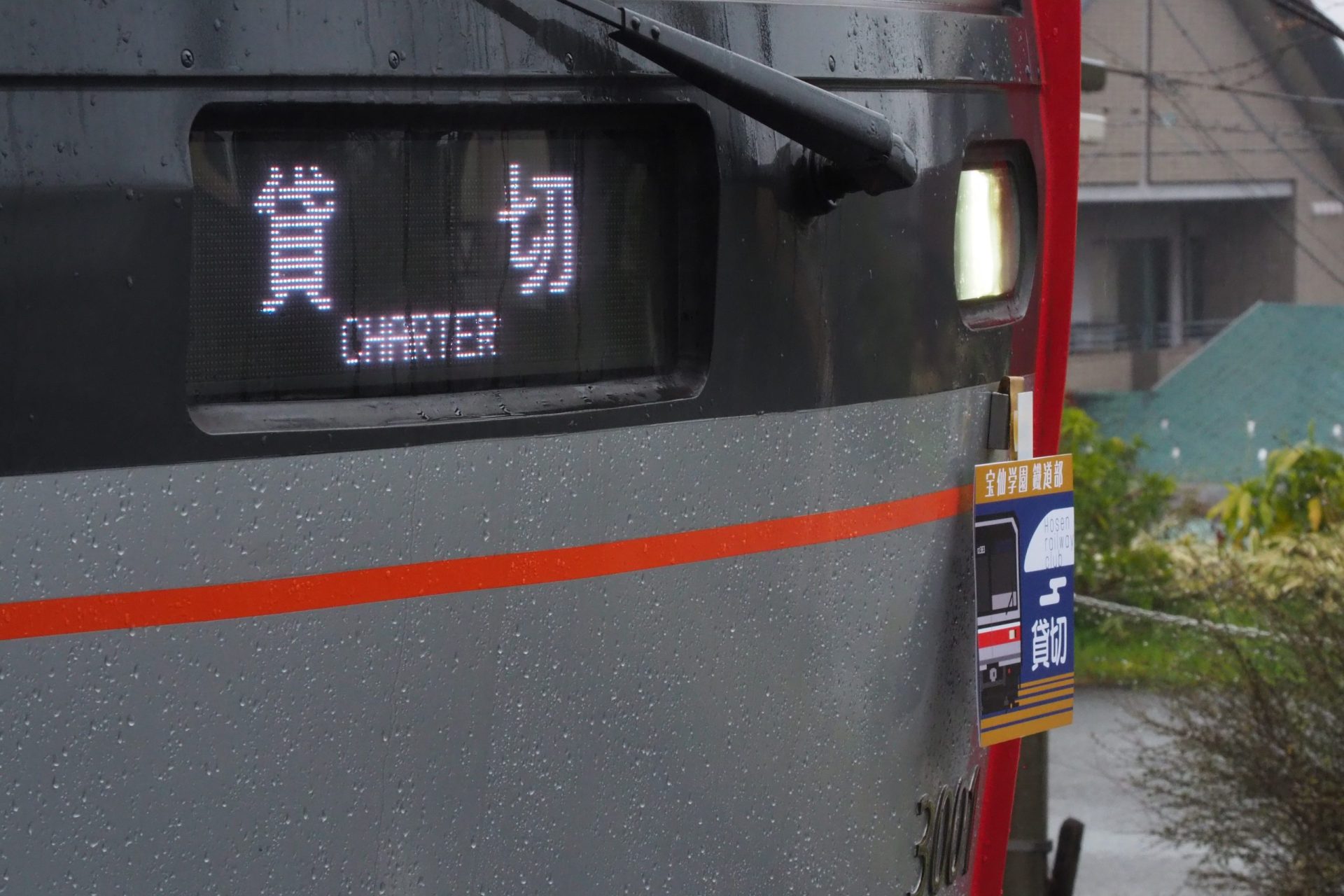 少し長めの停車となったため、車掌さんのご厚意により、車両前面の行き先表示器を変更し撮影させていただいたり、私たち鐵道部のロゴマークを掲出していただいたり、貸切状態のホームで模型を走らせたりと様々なことをさせていただきました。