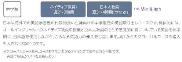 英語の授業だけ、取り出し授業を行い授業内容は1年間分先取りの授業をします。中学入学時は英検3級から準2級程度、高校進級時には英検準1級程度の英語力を養成しGL(グローバル)コースに合流することを目指します。