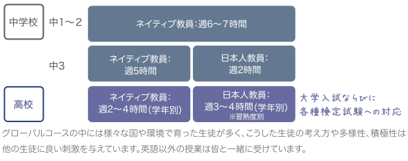 英語の授業だけ、取り出し授業でネイティブ教員の授業を受けます。中学入学時は英検2級程度、高校入学時には英検準1級程度の英語力が必要です。
