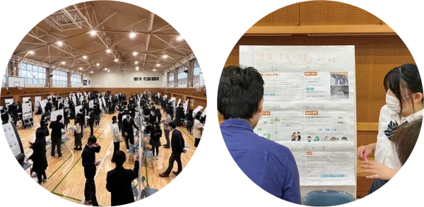 高校1年次の課題研究で学んだノウハウを活かし、1年間かけて自分の中の「問い」について探究します。そして大切なのは調べたことや学んだことをアウトプットすることです。体育館に生徒全員のブースを作成し、教員や保護者にむけてプレゼンテーションします。探究活動の総まとめです!