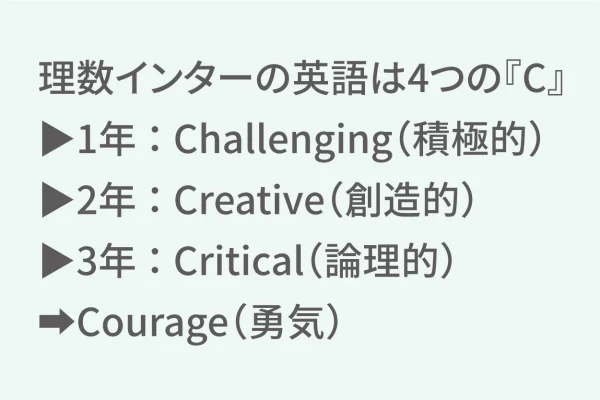 英語がなぜ使われているのか、なぜ、日本語とは違う表現なのか。英語を聴いた時、英語の文献を読んだ時、様々な疑問を持ち、それらを掘り下げていくと、他国の言語を学ぶ楽しさが分かってくると思います。英語を通して、その国の人の考え方や文化的な背景を知ろうという気持ちも大切です。ここから、しっかりとした英語の構造を学ぼうという姿勢も生まれてきます。理数インターの授業や行事で、多くの英語にふれてください。知識欲が刺激されて、自ずと“使える英語”も、大学受験を突破できる英語力も同時に身につくでしょう。