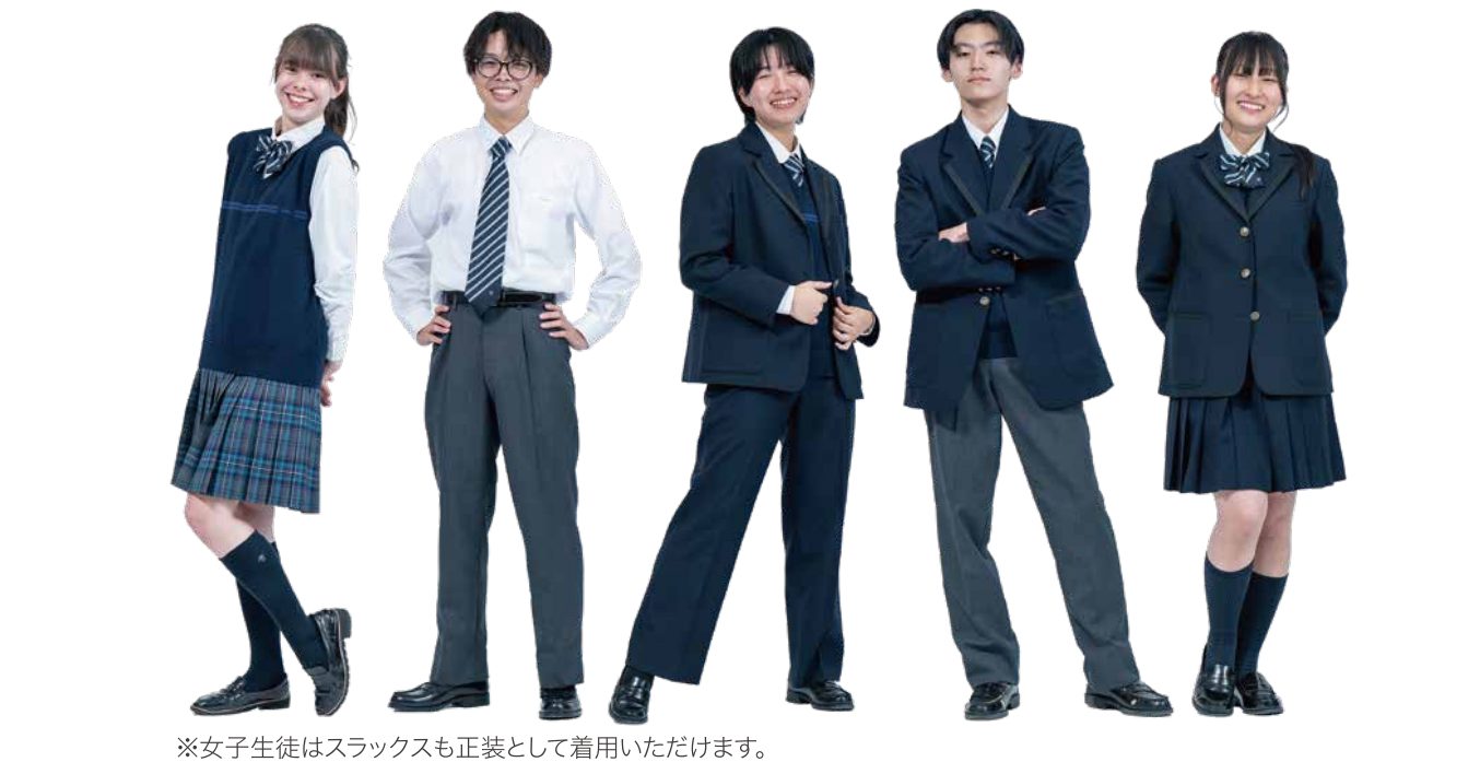 男女ともブレザースタイルで、イメージカラーはネイビーブルーです。落ち着いた色合いが理数インター生らしさを引き立てます。